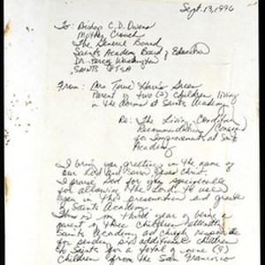 Terrie Harris-Sreen [Holmes-Sereen?], letter, 1996 September 13, 24 Buckelew Street, Marin City, California, to C.D. Owens, Emma F. Crouch (Saints Academy Board of Education), Percy Washington, Lexington, Mississippi. [Description English/roman)]