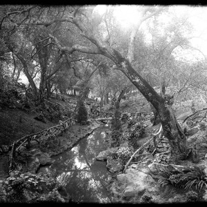 A view of the west part of the canyon of the Japanese garden, showing a stream lined with a low wooden fence. There are trees on both sides of the stream, and a path on the left. On verso: West Canyon.