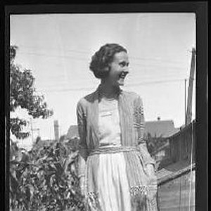 SERIES: 14 images labeled "Fern Crane and Gang, 1922." This image is of a woman standing out of doors.Buildings are behind her.