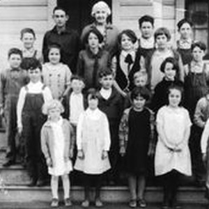 Photo--Black and white: Hall School circa 1920s. All the students of the school are standing of the steps of the school: Front row, L to R: Alma Sorenson, Esther Langdale, Ruth Smith, Emily Piezzi, Morton Smith. Second row: Norman Miller, Charles