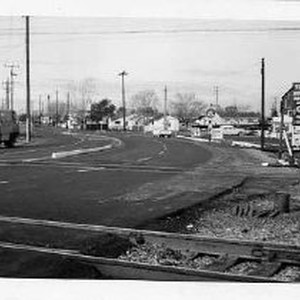 Street scene at Roseville Road and Grand Avenue showing houses, businesses, and an advertising sign for new homes. Railroad tracks are seen in the foreground.
