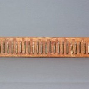 Twenty-two bullets mounted on a wood board.