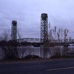 Sacramento River at flood stage passing under the Rio Vista Bridge.