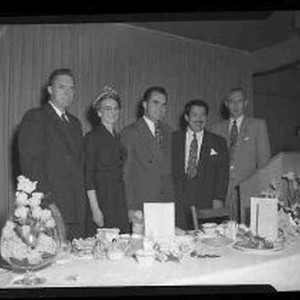 Richard Nixon and undientified group of people standing behind a baquet table on which is a podium and microphone.