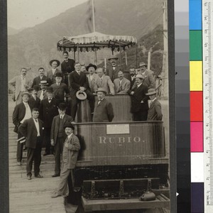 A group picture of Henry E. Huntington and associates at the Mount Lowe railway, which he had purchased in 1902. Group stands on and around the funicular car "Rubio." Huntington is on the platform immediately to the left of the car, third from the bottom. MS notes on verso read "Mt. Lowe, group includes HEH - also, probably, E--- Randolph (light suit, black hat, in the car)", "Gift of Mrs. Rox Donaldson, her uncle was E--- Randolph", and "HEH at Mt. Lowe, 1910?"