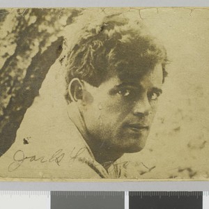 Jack London taken from side, his head turned to face the camera. Title transcribed from envelope. Copy print of original. London's signature is printed on bottom front of photo.