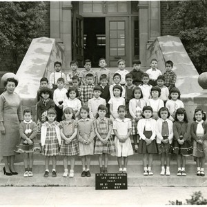 Mrs. Windon (far left) and the Grade B1 class assembled on the stoop of City Terrace [Elementary] School, 1957.