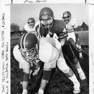 The photo caption printed in the Sacramento Bee on January 24, 1981 states: "Jim Lister, a running back in four previous games, awaits snap from center John Trefethen as he drills for his first Pig Bowl as starting quarterback for the Sacramento Police Department today a Hughes Stadium. Awaiting signals in the backfield are fullback Ted Mandalla, left, and tailback Ray Ross."