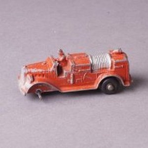 Red metal Tootsie Toy brand fire truck with metal fireman in cab. Missing front left wheel.