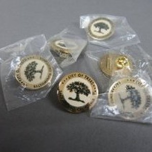 Six lapel pins with gold-colored backing. "City of Trees Sacramento California" with image of tree.