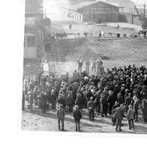 "Men assembled awaiting a 'ticket' to enter the City Shelter, part of which can be seen in the upper left side of photo. Bare ground between wash on line and assembled men is the site of the waterworks building (reconstructed and now the Discovery Museum). View is looking south along Front Street. The crane in the upper right side of photograph is still in place."