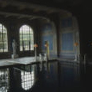 Sunlight shining through windows creates a mirror image on the water, in the indoor swimming pool at Hearst Castle.