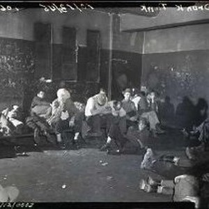 A group of men sitting on benches or lying on the floor of the county jail, drunk tank.