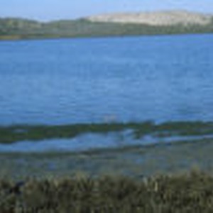 Panoramic view of Morro Bay with tidal flats in the foreground and sand dunes in the background.