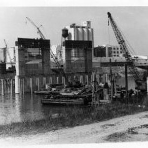 View of the construction of the W-X Street Bridge over the Sacramento River looing west into West Sacramento. Becomes the Pioneer Memorial Bridge