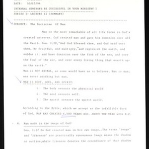 L. Wallace. "The doctrine of man", notes for a lecture (Internal seminary: Be successful in your ministry 1, series 1, lecture 12), 1994 October 15. [Description English/roman)]