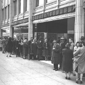 Crowd waits outside for store to open. Part of the promotion for United Air Lines Air Freight and their partnership with Weinstock's.