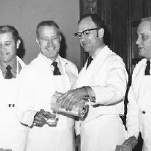 View of seven unidentified waiters at an Elks Club event. They wear white aprons and carry water pitchers.