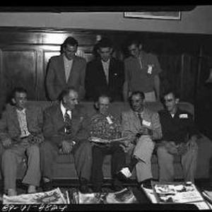 SERIES - two views of a group of men seating on a sofa and standing behind. A man in the middle is looking at an album. Inscribed on 1989/041/4825. "Honoring the Viegas family Oct. 21, 1954 Complimants of Southside Improvement Club"