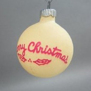 Yellow Christmas tree ornament with pink writing that reads "Merry Christmas."