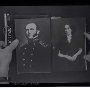 An unidentified person holding two protraits - one of a man in military uniform and one of a woman, both unidentified