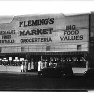 Photo--black and white: Fleming's Market Grocerteria in downtown Sebastopol 1936. Nine men employees stand in front of store and vintage cars are parked on the street. L-R: Lee Orc, George Barbolis, Earl Lawrence, Chet Lawrence, Harry White, Paul Badger and Al Carter. Fleming's was located at 108 North Main Street. Robert L. Fleming opened his store in 1929 and it was in business until the 1960s when it burned down.
