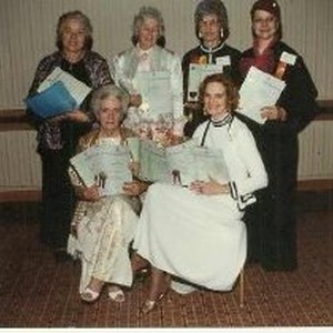 Two women are seated while four others stand behind them. They are all holding papers. Photo is glued onto paper. Below the photo is written, "California Delegates, Atlanta 1982: Frances Burt, Ruby McLeod, Nettie Campbell" Photograph removed from file folder, NorCal Events, 2003/051/021.