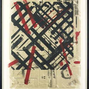 A recreation of an Asian newspaper with advertisements along the right side covered by a bold crosshatch of black and red ink. A drawing of a woman's face and hands advertises a sauce at the bottom right corner.