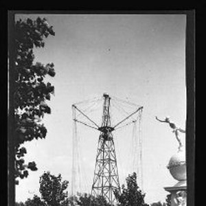 SERIES: Ten views of Al Fresco Park , an amusement park in Chicago, IL about 1905. This view shows the aparatus for a ride in the center and to the right a monument and statue.