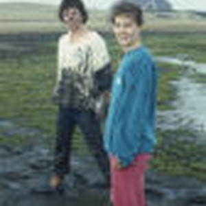 Two students pose after digging for clams in the tidal flats with sand dunes, and Morro Rock in the background.