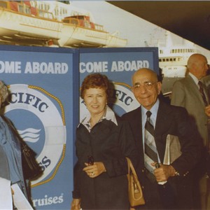 Leon and Alice Peters with unidentified woman, boarding cruise ship