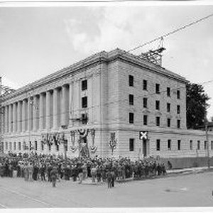 Exterior view of the construction site for the new Sacramento Post Office and Federal Courthouse at 805 I Street between 8th and 9th Streets. This view is showing the cornerstone laying ceremonies at 9th and I Streets.