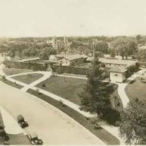 Elevated view of Sutter's Fort, looking west. Automobiles shown along L Street across from the fort.