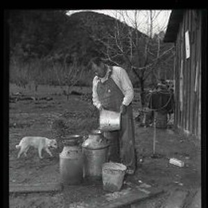 Indians on reservation in Rumsey, Yolo County - Man filling milk can, dog nearby. 2/12/1950 4 of 5