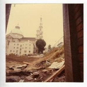 Street scene of construction site for a new parking garage at 1100 J Street. On the left is the Cathedral of the Blessed Sacrament. The state capitol building is in the far background.