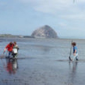Pat Flynn, Dan Henderson, Molly Kellogg, and Denny Watumull walk through the mudflats as the tide rises, with sand dunes and Morro rock in the background.