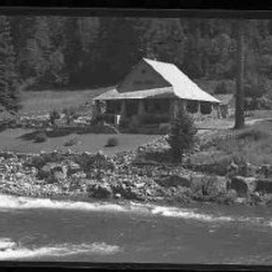 View of mountain cabins. They are not specifically identified and could be at Lake Tahoe or Donner Lake.