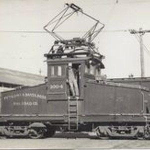 Photo--black and white: Freight motor 1004 of the P&SR Railroad. These motors were used heavily during the fruit harvest season in Sonoma County. The Overnight Freight Express ran refrigerator cars that carried apples and berries to Petaluma and on to San Francisco via steamer ships.