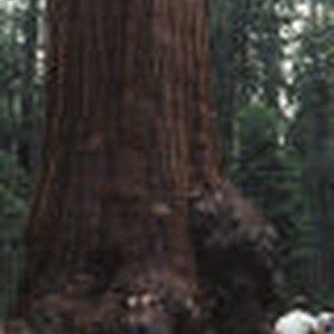 Nature enthusiasts standing in front of the trunk of a giant sequoia in the Giant Forest at Sequoia National Park.