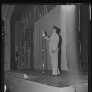 SERIES - An unidentified man, standing in front of a microphone on a stage.