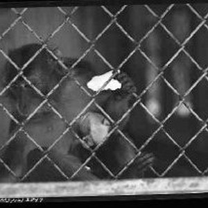 Zoo Monkey sitting in cage with bit of bread in hand.