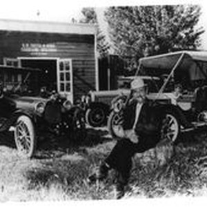 Photo--black and white: George Smith of Georgetown in Sebastopol circa 1980s. George is seated on a stump with three vintage cars in background. Behind cars is garage with sign painted on front: "G. H. Smith & Sons Carriage Builders June 4, 1884"