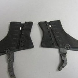 Men's black suede spats with seven black metal-shank exterior side buttons and metal buckle.