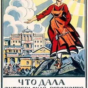 A poster dedicated to the soviet women. Caption reads, "Chto dala Oktiabr'skaia revoliutsiia rabotnitse i krest'ianke / Что дала Октябрьская революция работнице и крестьянке", meaning, "This is what the October revolution has given to female workers and female peasants". [Description English/roman)]