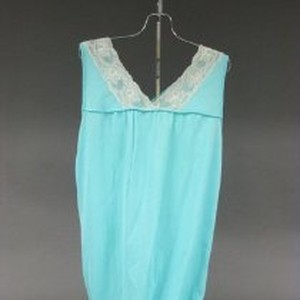 Women's nightgown, blue nylon with white lace trim at neck.