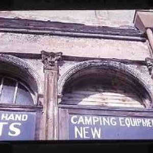 Close-up view of windows, arches, and columns of building next door to the Fashion Saloon.