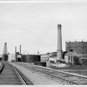 Copy Print. Exterior view of the Pacific Gas and Electric Company's gas works on Front and T Streets in Sacramento.