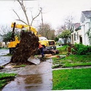 Uprooted tree from heavy rains associated with "El Nino." Workers remove it with heavy equipment from a neighborhood setting.