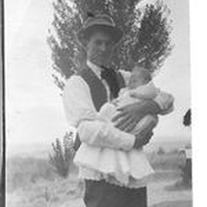 Photo--black & white: Alfred Leslie Kingwell (1892-1979) with his infant daughter-- probably Dorothy Kingwell. Leslie enlisted in 1917 to fight in WWI, and at that time had two children. Handwritten on verso: "Leslie & baby Aunt Lucy from Leslie" Leslie's aunt was Lucy Jonas Kingwell. See similar photo #10377.