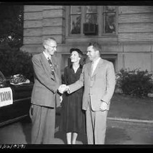 7/19/52 - Senator Nixon speaks in Plaza Park. Senator and Mr.s Nixon greeted by Mayor of Sacramento. - 3 of 4